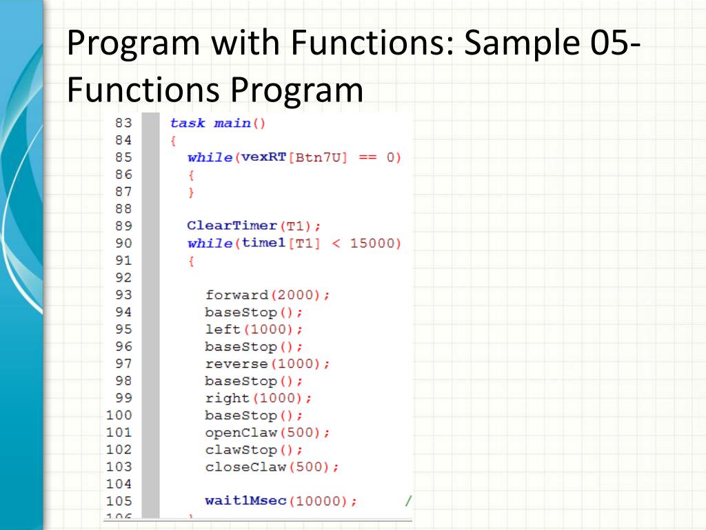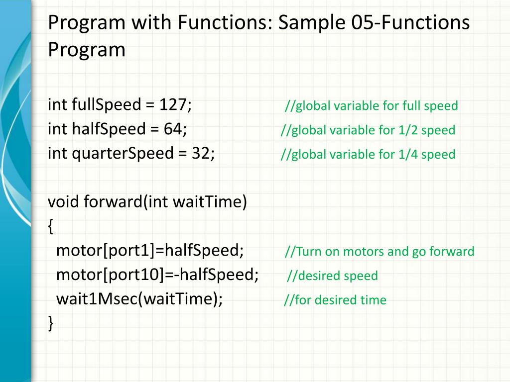 Program with Functions: Sample 05-Functions Program intfullSpeed = 127; //global variable for full speed inthalfSpeed = 64; //global variable for 1/2 speed intquarterSpeed = 32; //global variable for 1/4 speed void forward(intwaitTime) { motor[port1]=halfSpeed; //Turn on motors and go forward motor[port10]=-halfSpeed; //desired speed wait1Msec(waitTime); //for desired time }