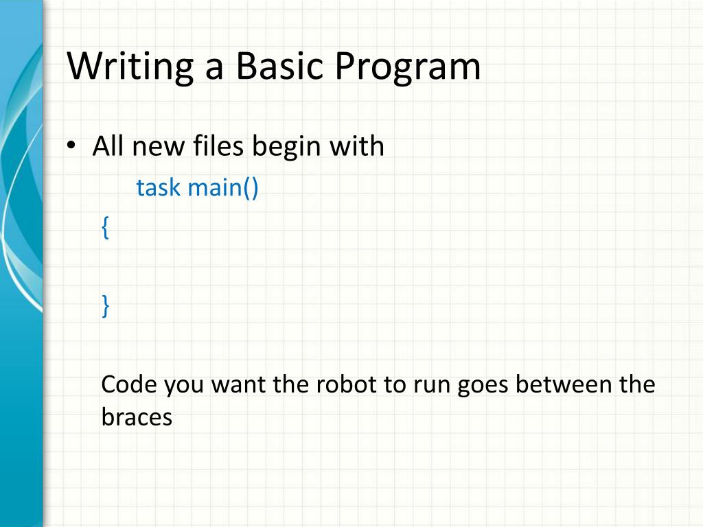 Writing a Basic Program • All new files begin with task main() { } Code you want the robot to run goes between the braces