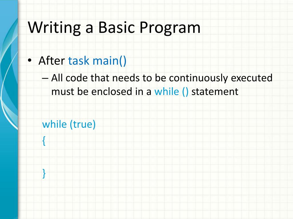 Writing a Basic Program • After task main() • All code that needs to be continuously executed must be enclosed in a while () statement while (true) { }