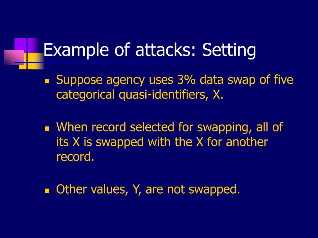 Example of attacks: Setting • Suppose agency uses 3% data swap of five categorical quasi-identifiers, X. • When record selected for swapping, all of its X is swapped with the X for another record. • Other values, Y, are not swapped.