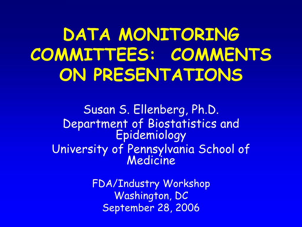 DATA MONITORING COMMITTEES: COMMENTS ON PRESENTATIONS Susan S. Ellenberg, Ph.D. Department of Biostatistics and Epidemiology University of Pennsylvania School of Medicine FDA/Industry Workshop Washington, DC September 28, 2006