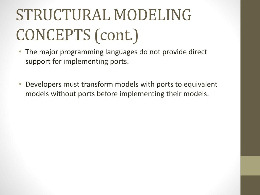 STRUCTURAL MODELING CONCEPTS (cont.) • The major programming languages do not provide direct support for implementing ports. • Developers must transform models with ports to equivalent models without ports before implementing their models.