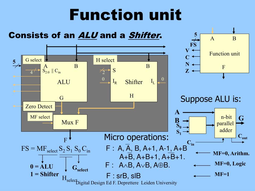 5 A B Function unit FS V C N Z H select G select 5 B A B ALU Shifter F S S2:0 || Cin 4 2 0 0 IR IL H G Zero Detect A n-bit G MF select Mux F B parallel adder S0 S1 Cout Cin F : A, A, B, A+1, A-1, A+B A+B, A+B+1, A+B+1. MF=0, Arithm. MF=0, Logic 0 = ALU 1 = Shifter Gselect MF=1 Hselect Function unit Consists of an ALU and a Shifter. Suppose ALU is: Micro operations: F FS = MFselect S2 S1 S0 Cin F : AB, AB, AB. F : srB, slB Digital Design Ed F. Deprettere Leiden University