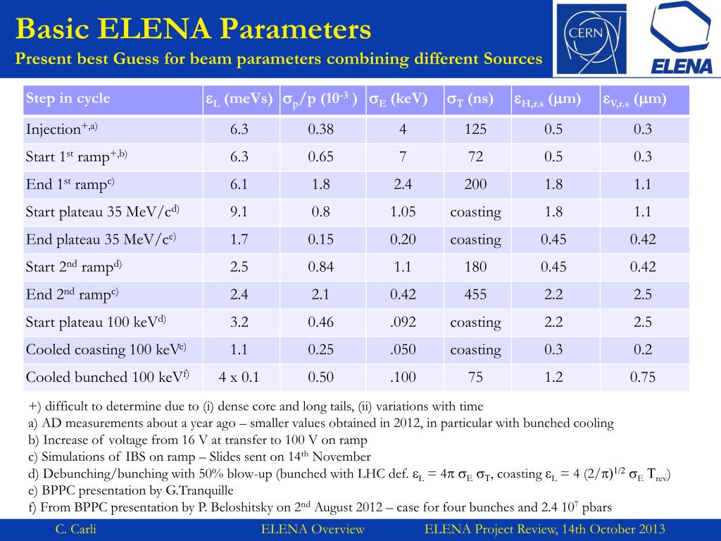 Basic ELENA ParametersPresent best Guess for beam parameters combining different Sources +) difficult to determine due to (i) dense core and long tails, (ii) variations with time a) AD measurements about a year ago – smaller values obtained in 2012, in particular with bunched cooling b) Increase of voltage from 16 V at transfer to 100 V on ramp c) Simulations of IBS on ramp – Slides sent on 14th November d) Debunching/bunching with 50% blow-up (bunched with LHC def. eL = 4psEsT, coasting eL = 4 (2/p)1/2sETrev) e) BPPC presentation by G.Tranquille f) From BPPC presentation by P. Beloshitsky on 2nd August 2012 – case for four bunches and 2.4 107pbars C. Carli ELENA Overview ELENA Project Review, 14th October 2013