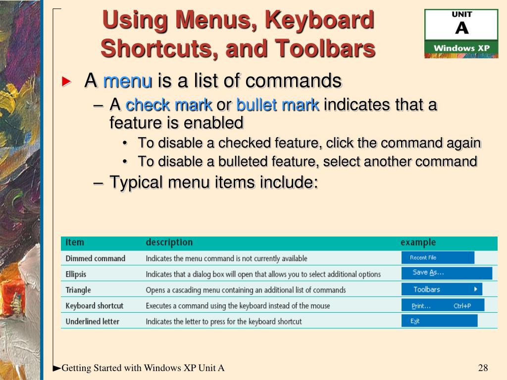 Using Menus, Keyboard Shortcuts, and Toolbars • A menu is a list of commands • A check mark or bullet mark indicates that a feature is enabled • To disable a checked feature, click the command again • To disable a bulleted feature, select another command • Typical menu items include: Getting Started with Windows XP Unit A