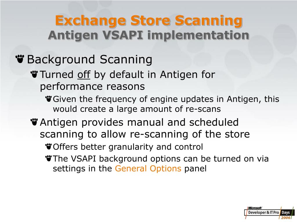 Agenda • Exchange Store Scanning • Exchange VSAPI 2.5 • Background Scanning • Proactive Scanning • On-access Scanning • Antigen VSAPI Implementation • Antigen General Options