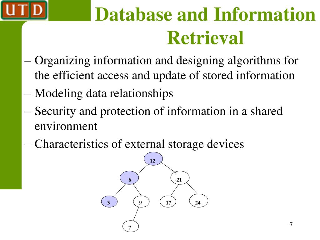 12 6 21 3 9 17 24 7 Database and Information Retrieval • Organizing information and designing algorithms for the efficient access and update of stored information • Modeling data relationships • Security and protection of information in a shared environment • Characteristics of external storage devices