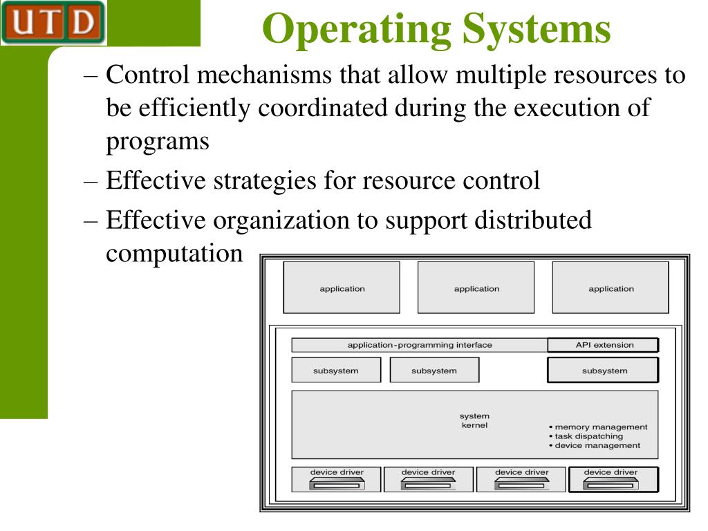Operating Systems • Control mechanisms that allow multiple resources to be efficiently coordinated during the execution of programs • Effective strategies for resource control • Effective organization to support distributed computation