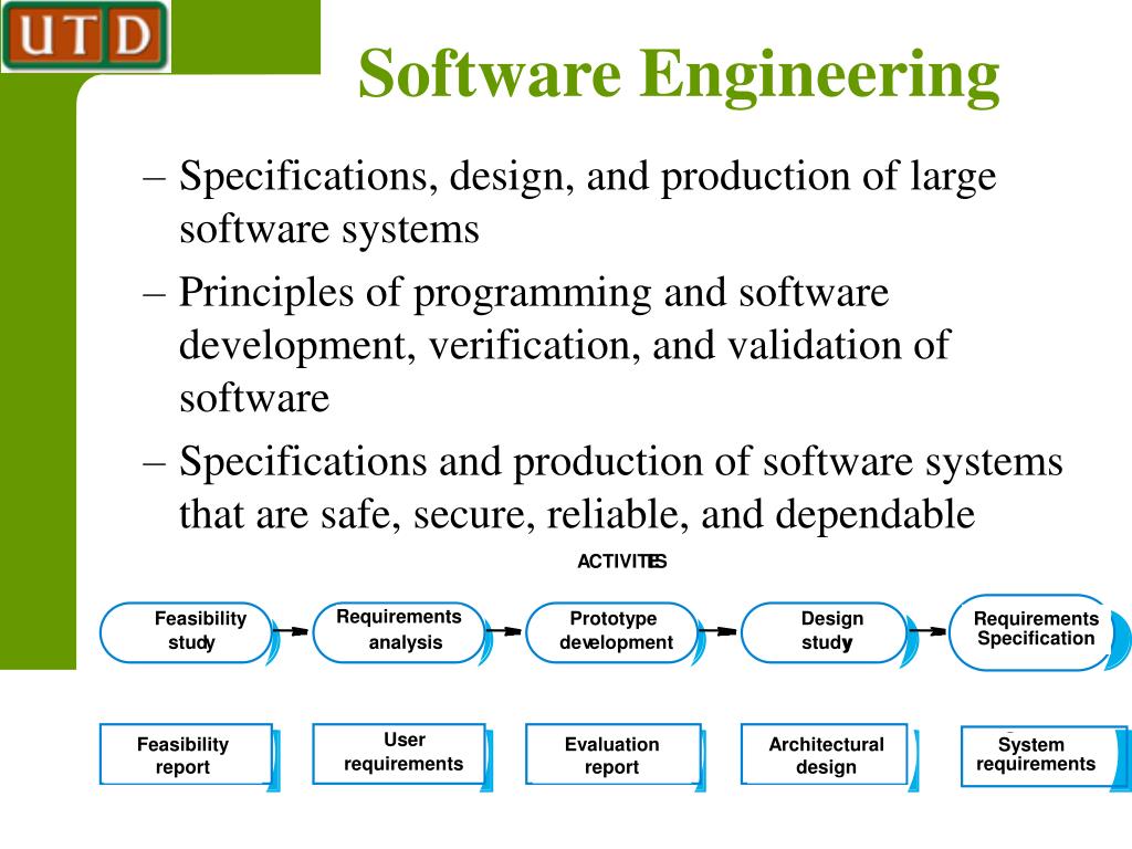 A CTIVITI E S Requirements Requirements Specification Feasibility R Prototype Pr Design R equir ements stud y anal ysis de v elopment study y specifica tion Feasibility report Evaluation report Architectural design F easibility User Ev alua tion Ar chitectur al S System r epor t requirements r epor t design requirements Software Engineering • Specifications, design, and production of large software systems • Principles of programming and software development, verification, and validation of software • Specifications and production of software systems that are safe, secure, reliable, and dependable