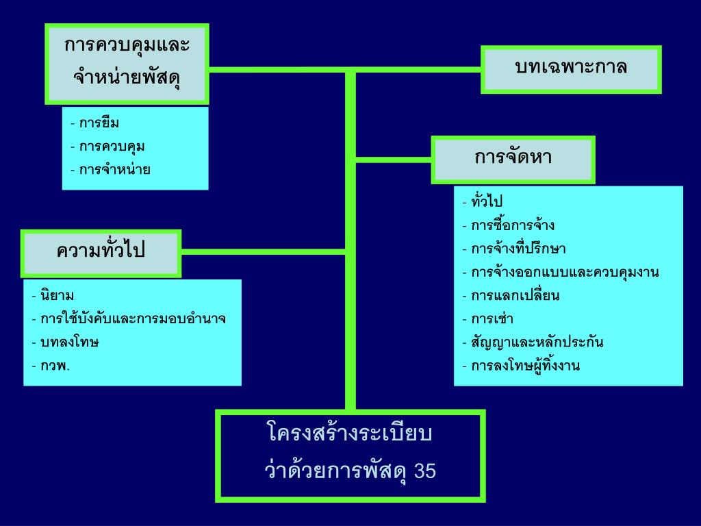 การควบคุมและจำหน่ายพัสดุการควบคุมและจำหน่ายพัสดุ บทเฉพาะกาล • การยืม • การควบคุม • การจำหน่าย การจัดหา • ทั่วไป • การซื้อการจ้าง • การจ้างที่ปรึกษา • การจ้างออกแบบและควบคุมงาน • การแลกเปลี่ยน • การเช่า • สัญญาและหลักประกัน • การลงโทษผู้ทิ้งงาน ความทั่วไป • นิยาม • การใช้บังคับและการมอบอำนาจ • บทลงโทษ • กวพ. โครงสร้างระเบียบ ว่าด้วยการพัสดุ 35
