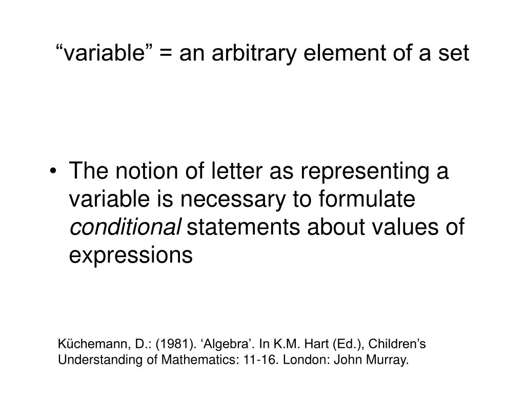 “variable” = an arbitrary element of a set • The notion of letter as representing a variable is necessary to formulate conditional statements about values of expressions Küchemann, D.: (1981). ‘Algebra’. In K.M. Hart (Ed.), Children’s Understanding of Mathematics: 11‑16. London: John Murray.