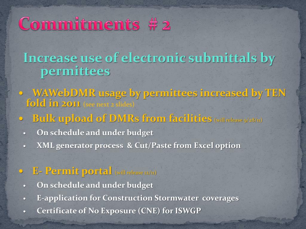 Commitments # 2 Increase use of electronic submittals by permittees • WAWebDMR usage by permittees increased by TEN fold in 2011(see next 2 slides) • Bulk upload of DMRs from facilities (will release 9/28/11) • On schedule and under budget • XML generator process & Cut/Paste from Excel option • E- Permit portal (will release 12/11) • On schedule and under budget • E-application for Construction Stormwater coverages • Certificate of No Exposure (CNE) for ISWGP