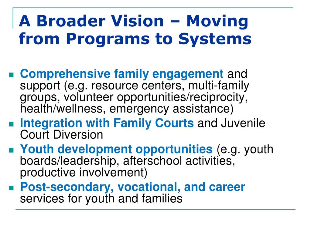 A Broader Vision – Moving from Programs to Systems • Comprehensive family engagement and support (e.g. resource centers, multi-family groups, volunteer opportunities/reciprocity, health/wellness, emergency assistance) • Integration with Family Courts and Juvenile Court Diversion • Youth development opportunities (e.g. youth boards/leadership, afterschool activities, productive involvement) • Post-secondary, vocational, and career services for youth and families