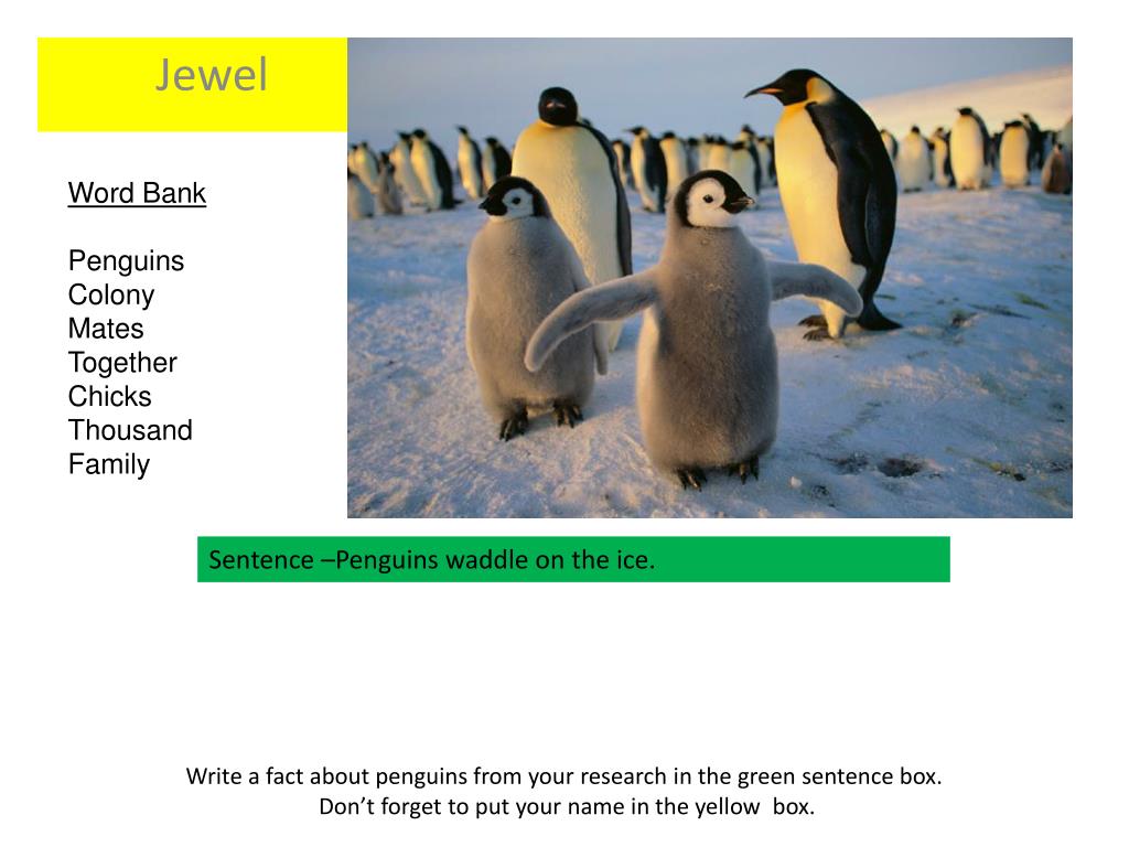 Word Bank Penguins Colony Mates Together Chicks Thousand Family Write a fact about penguins from your research in the green sentence box. Don’t forget to put your name in the yellow box. Jewel Sentence –Penguins waddle on the ice.