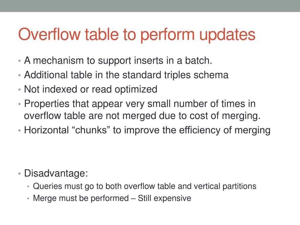 Overflow table to perform updates • A mechanism to support inserts in a batch. • Additional table in the standard triples schema • Not indexed or read optimized • Properties that appear very small number of times in overflow table are not merged due to cost of merging. • Horizontal “chunks” to improve the efficiency of merging • Disadvantage: • Queries must go to both overflow table and vertical partitions • Merge must be performed – Still expensive