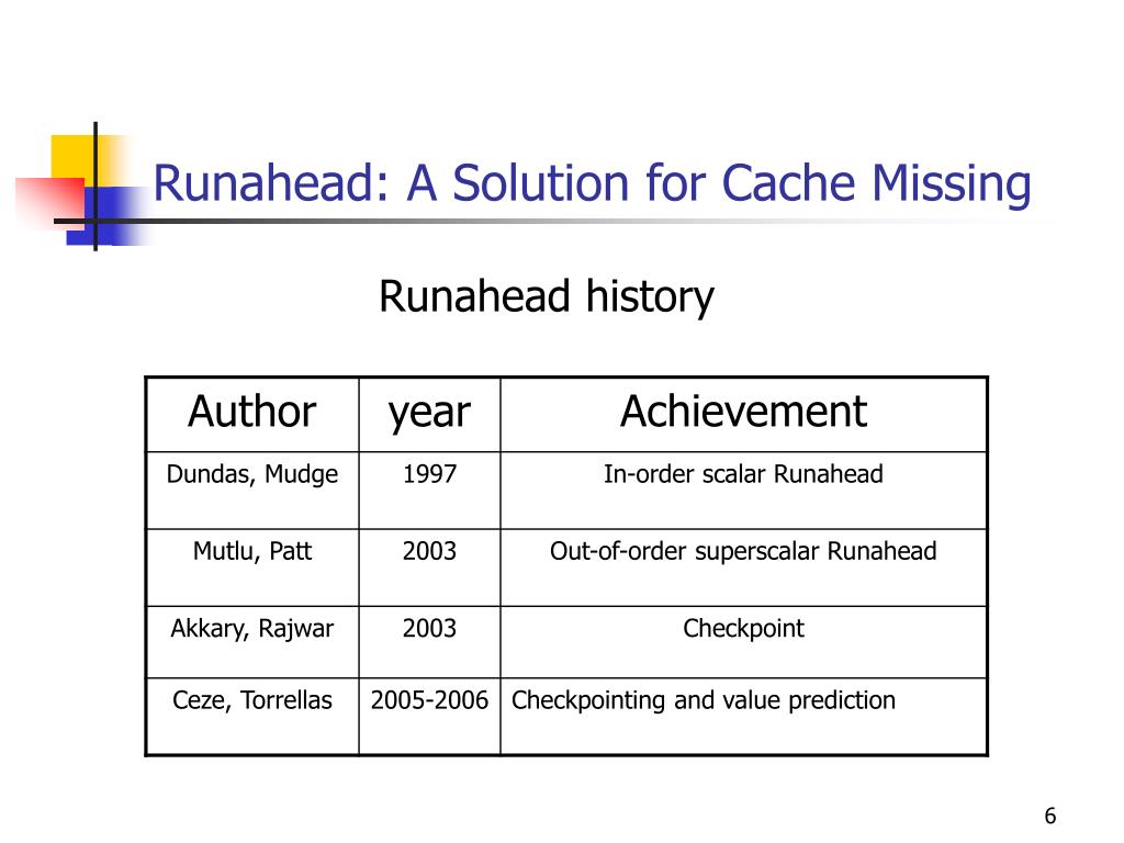 Reference [1]J. Dundas and T. Mudge. Improving data cache performance by pre-executing instructions under a cache miss. In ICS-11, 1997. [2] J. D. Dundas. Improving Processor performance by Dynamically Pre-Processing the Instruction Stream. PhD thesis, Univ. of Michigan, 1998. [3] O. Mutlu, J. Stark, C.Wilkerson, and Y. N. Patt. Runahead execution: An alternative to very large instruction windows for out-of-order processors. In HPCA-9, pages 129–140, 2003. [4] H. Akkary, R. Rajwar, and S. T. Srinivasan. Checkpoint processing and recovery: Towards scalable large instruction window processors. In MICRO-36, pages 423–434, 2003. [5] L.Ceze, K.Strauss, J.Tuck, J. Renau and J.Torrellas CAVA: Hiding L2 Misses with Checkpoint-Assisted Value Pridiction, In Computer Architecture Letters, 2006