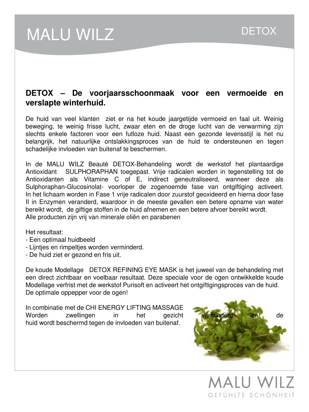 MALU WILZ DETOX DETOX – De voorjaarsschoonmaak voor een vermoeide en verslapte winterhuid. De huid van veel klanten ziet er na het koude jaargetijde vermoeid en faal uit. Weinig beweging, te weinig frisse lucht, zwaar eten en de droge lucht van de verwarming zijn slechts enkele factoren voor een futloze huid. Naast een gezonde levensstijl is het nu belangrijk, het natuurlijke ontslakkingsproces van de huid te ondersteunen en tegen schadelijke invloeden van buitenaf te beschermen. • In de MALU WILZ Beauté DETOX-Behandeling wordt de werkstof het plantaardige Antioxidant SULPHORAPHAN toegepast. Vrije radicalen worden in tegenstelling tot de Antioxidanten als Vitamine C of E, indirect geneutraliseerd, wanneer deze als Sulphoraphan-Glucosinolat- voorloper de zogenoemde fase van ontgiftiging activeert. In het lichaam worden in Fase 1 vrije radicalen door zuurstof geoxideerd en hierna door fase II in Enzymen veranderd, waardoor in de meeste gevallen een betere opname van water bereikt wordt, de giftige stoffen in de huid afnemen en een betere afvoer bereikt wordt. • Alle producten zijn vrij van minerale oliën en parabenen Het resultaat: - Een optimaal huidbeeld - Lijntjes en rimpeltjes worden verminderd. • De huid ziet er gezond en fris uit. • De koude Modellage DETOX REFINING EYE MASK is het juweel van de behandeling met een direct zichtbaar en voelbaar resultaat. Deze speciale voor de ogen ontwikkelde koude Modellage verfrist met de werkstof Purisoft en activeert het ontgiftigingsproces van de huid. • De optimale oppepper voor de ogen! • In combinatie met de CHI ENERGY LIFTING MASSAGE • Worden zwellingen in het gezicht verminderd en de huid wordt beschermd tegen de invloeden van buitenaf.