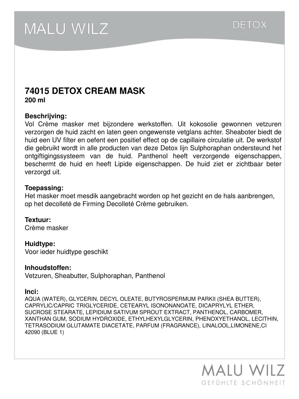 74015 DETOX CREAM MASK 200 ml Beschrijving: Vol Crème masker met bijzondere werkstoffen. Uit kokosolie gewonnen vetzuren verzorgen de huid zacht en laten geen ongewenste vetglans achter. Sheaboter biedt de huid een UV filter en oefent een positief effect op de capillaire circulatie uit. De werkstof die gebruikt wordt in alle producten van deze Detox lijn Sulphoraphan ondersteund het ontgiftigingssysteem van de huid. Panthenol heeft verzorgende eigenschappen, beschermt de huid en heeft Lipide eigenschappen. De huid ziet er zichtbaar beter verzorgd uit. Toepassing: Het masker moet mesdik aangebracht worden op het gezicht en de hals aanbrengen, op het decolleté de Firming Decolleté Crème gebruiken. Textuur: Crème masker Huidtype: Voor ieder huidtype geschikt Inhoudstoffen: Vetzuren, Sheabutter, Sulphoraphan, Panthenol Inci: AQUA (WATER), GLYCERIN, DECYL OLEATE, BUTYROSPERMUM PARKII (SHEA BUTTER),CAPRYLIC/CAPRIC TRIGLYCERIDE, CETEARYL ISONONANOATE, DICAPRYLYL ETHER,SUCROSE STEARATE, LEPIDIUM SATIVUM SPROUT EXTRACT, PANTHENOL,CARBOMER,XANTHAN GUM, SODIUM HYDROXIDE, ETHYLHEXYLGLYCERIN, PHENOXYETHANOL,LECITHIN, TETRASODIUM GLUTAMATE DIACETATE, PARFUM (FRAGRANCE),LINALOOL,LIMONENE,CI 42090 (BLUE 1) Etox