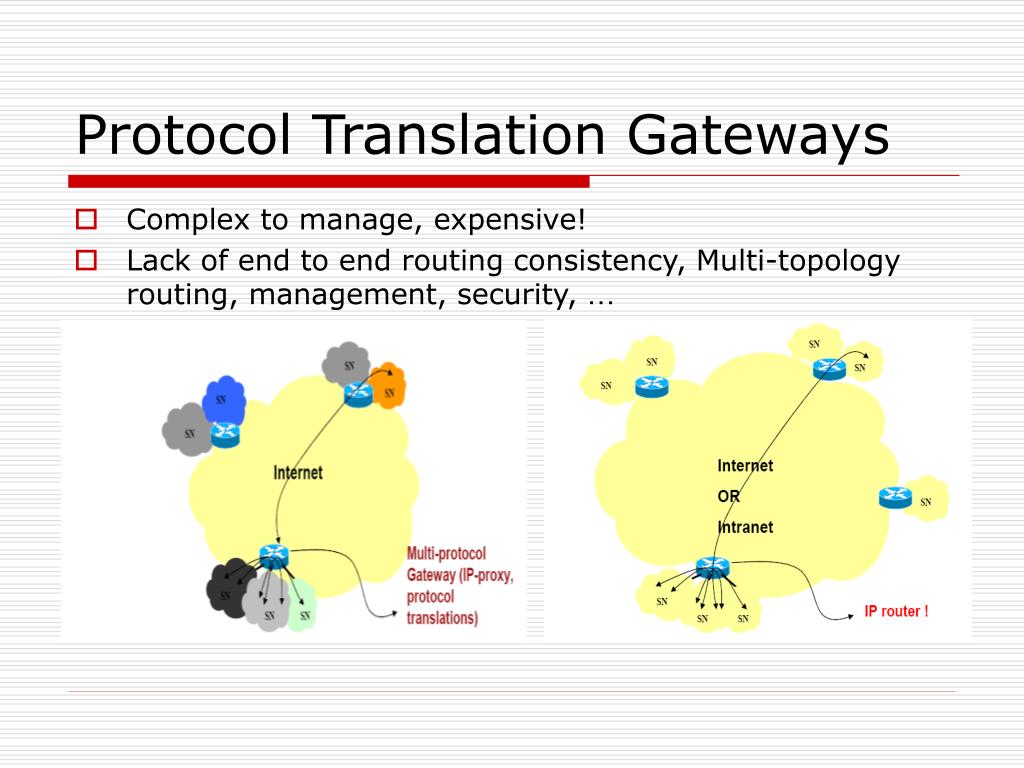 Protocol Translation Gateways • Complex to manage, expensive! • Lack of end to end routing consistency, Multi-topology routing, management, security, …
