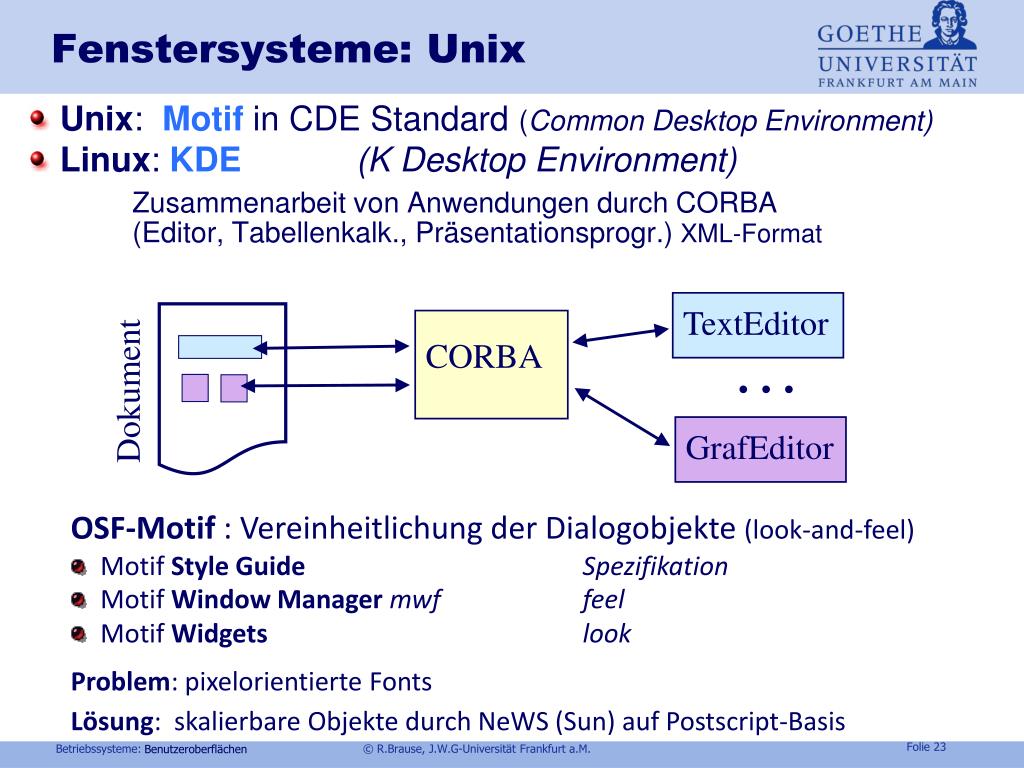 Fenstersysteme: Unix Dokument . . . GrafEditor • Unix: Motif in CDE Standard (Common Desktop Environment) • Linux: KDE (K Desktop Environment) Zusammenarbeit vonAnwendungen durch CORBA (Editor, Tabellenkalk., Präsentationsprogr.) XML-Format TextEditor CORBA • OSF-Motif : Vereinheitlichung der Dialogobjekte (look-and-feel) • Motif Style Guide Spezifikation • Motif Window Managermwffeel • Motif Widgetslook • Problem: pixelorientierte Fonts • Lösung: skalierbare Objekte durch NeWS (Sun) auf Postscript-Basis Benutzeroberflächen