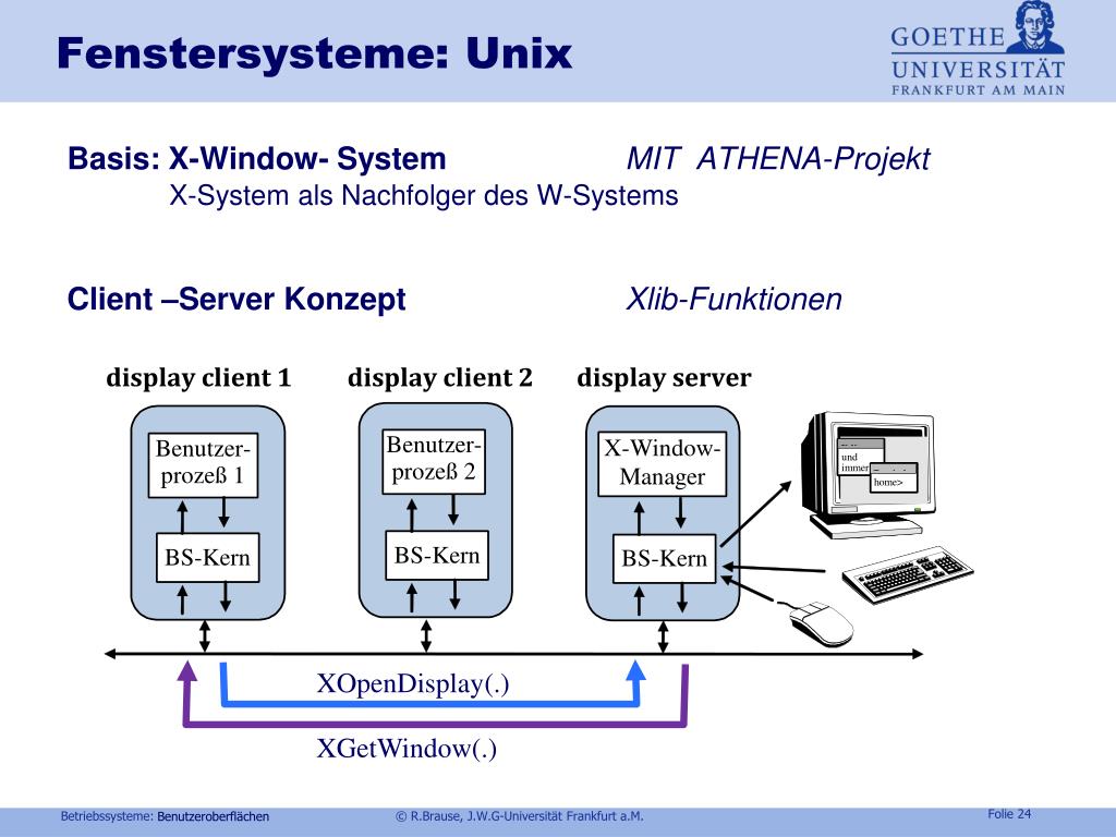Fenstersysteme: Unix Basis: X-Window- System MIT ATHENA-Projekt X-System als Nachfolger des W-Systems Client –Server KonzeptXlib-Funktionen XOpenDisplay(.) XGetWindow(.) Benutzeroberflächen