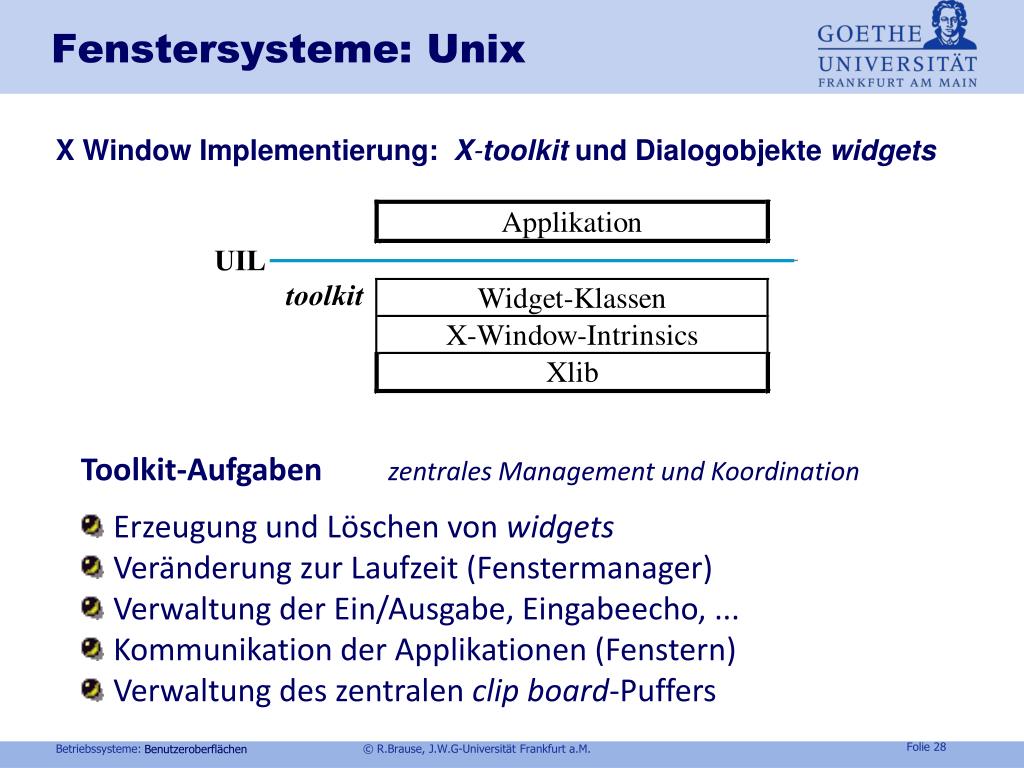 Fenstersysteme: Unix X Window Implementierung:X-toolkit und Dialogobjekte widgets Toolkit-Aufgaben zentrales Management und Koordination Erzeugung und Löschen von widgets Veränderung zur Laufzeit (Fenstermanager) Verwaltung der Ein/Ausgabe, Eingabeecho, ... Kommunikation der Applikationen (Fenstern) Verwaltung des zentralen clipboard-Puffers Benutzeroberflächen