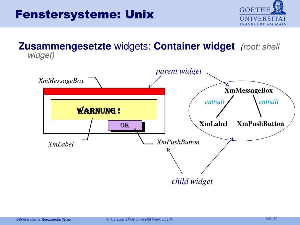 Fenstersysteme: Unix parent widget XmMessageBox XmMessageBox enthält en t hält WARNUNG ! XmLabel XmPushButton OK XmPushButton XmLabel child widget Zusammengesetzte widgets: Container widget(root: shell widget) Benutzeroberflächen