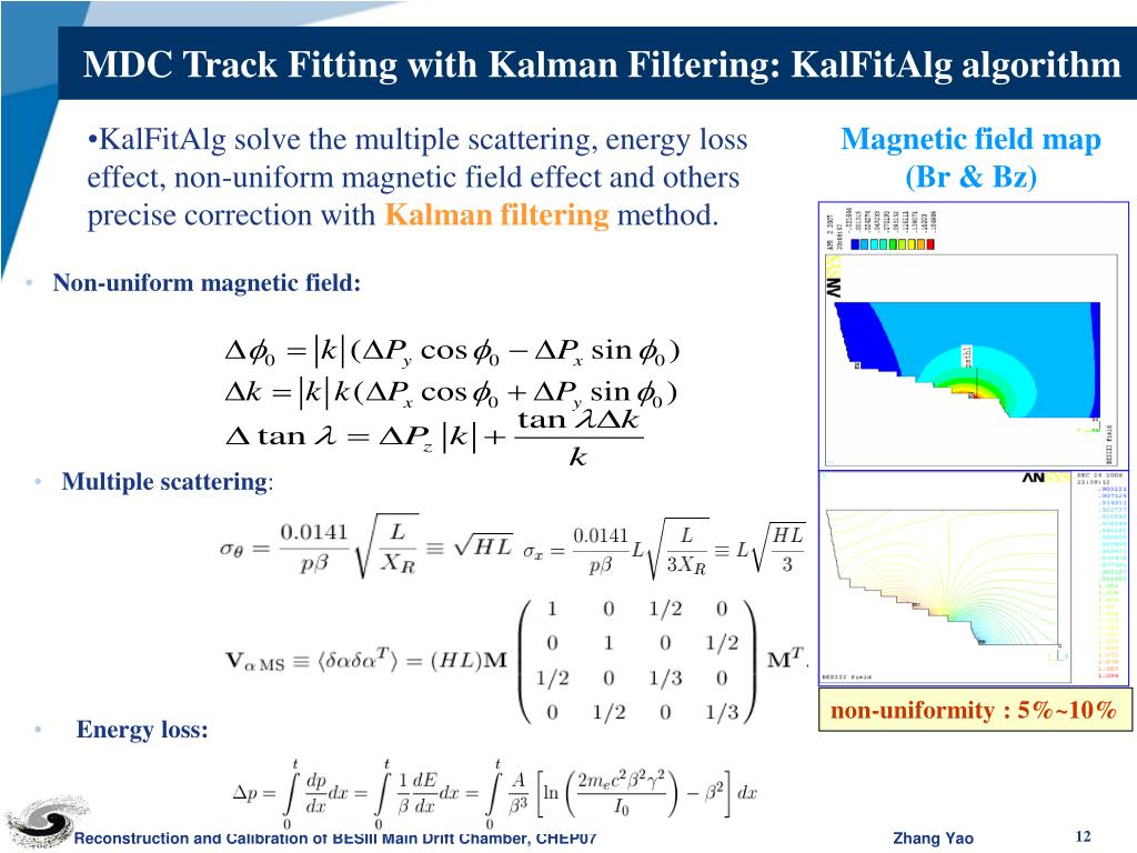 MDC Track Fitting with Kalman Filtering: KalFitAlg algorithm • KalFitAlgsolve the multiple scattering, energy loss effect, non-uniform magnetic field effect and others precise correction with Kalman filtering method. Magnetic field map (Br & Bz) • Non-uniform magnetic field: • Multiple scattering: non-uniformity : 5%~10% • Energy loss: