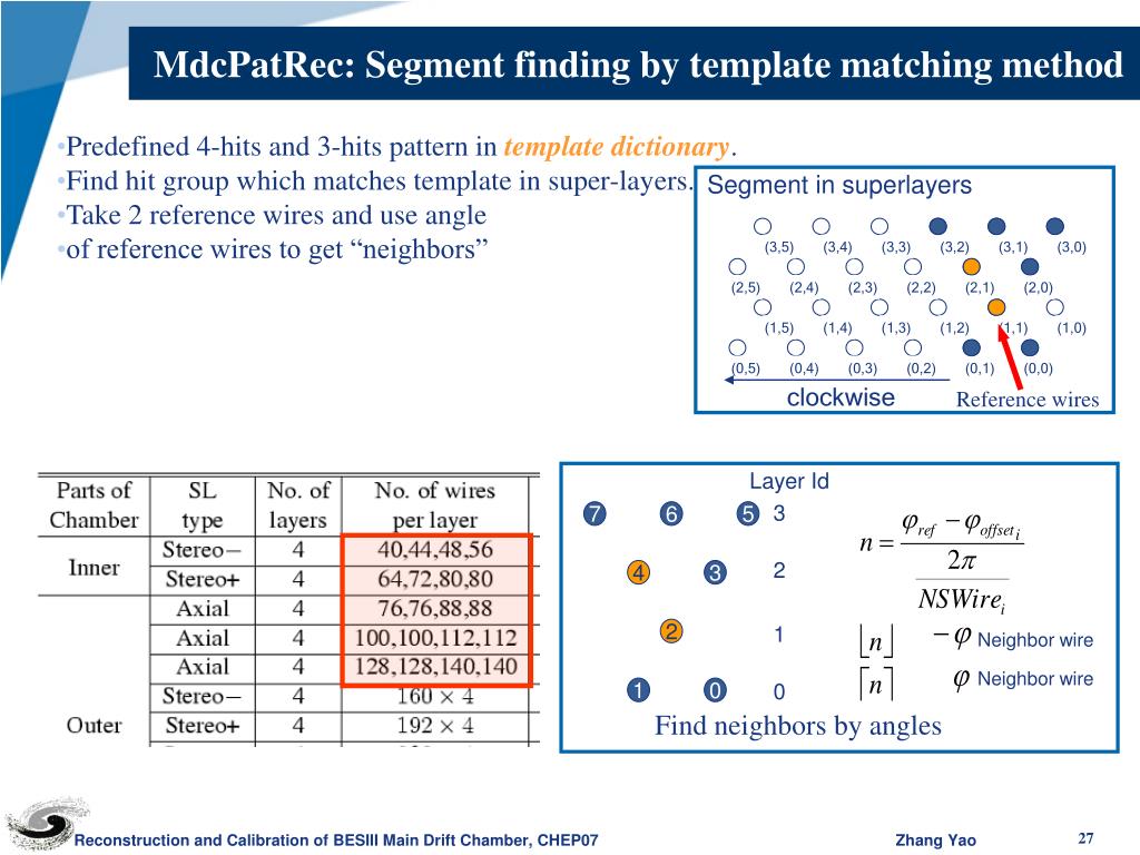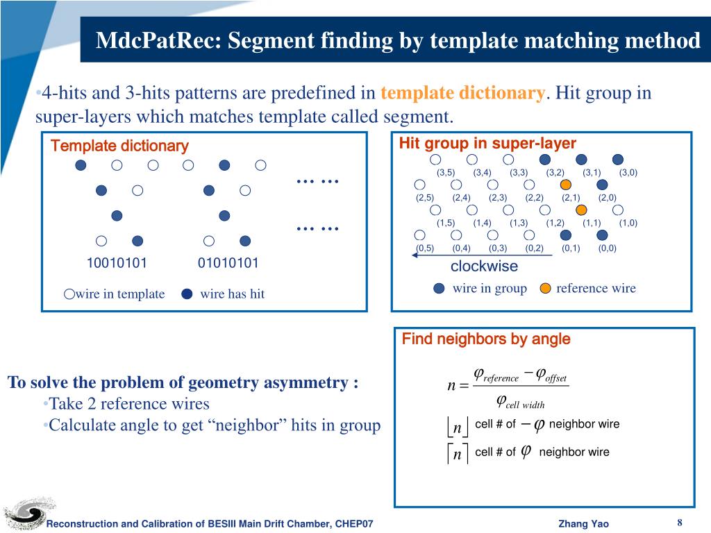 Template dictionary Hit group in super-layer … … … … wire in template wire has hit wire in group reference wire 10010101 01010101 cell # of neighbor wire cell # of neighbor wire (2,5) (3,5) (0,5) (1,5) (3,4) (1,4) (0,4) (2,4) (1,3) (2,3) (0,3) (3,3) (0,2) (3,2) (1,2) (2,2) (3,1) (1,1) (2,1) (0,1) (0,0) (3,0) (1,0) (2,0) clockwise MdcPatRec: Segment finding by template matching method • 4-hits and 3-hits patterns are predefined in template dictionary.Hit group in super-layers which matches template called segment. Find neighbors by angle • To solve the problem of geometry asymmetry : • Take 2 reference wires • Calculate angle to get “neighbor” hits in group