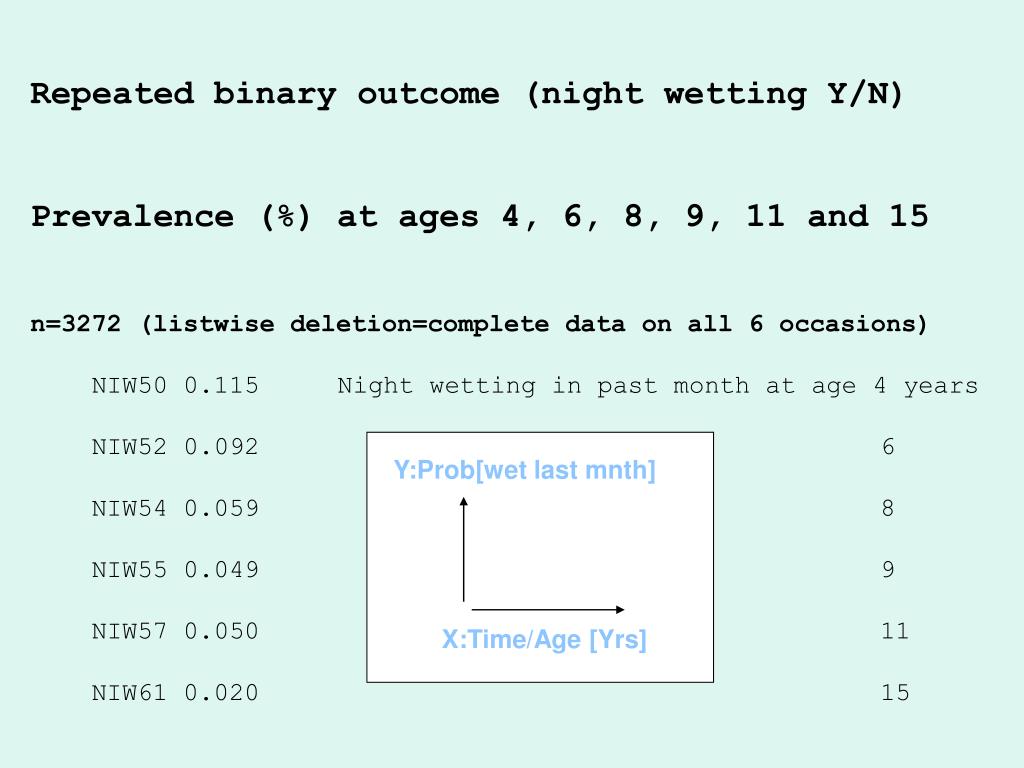 Repeated binary outcome (night wetting Y/N) Prevalence (%) at ages 4, 6, 8, 9, 11 and 15 n=3272 (listwise deletion=complete data on all 6 occasions) NIW50 0.115 Night wetting in past month at age 4 years NIW52 0.092 6 NIW54 0.059 8 NIW55 0.049 9 NIW57 0.050 11 NIW61 0.020 15 Y:Prob[wet last mnth] X:Time/Age [Yrs]