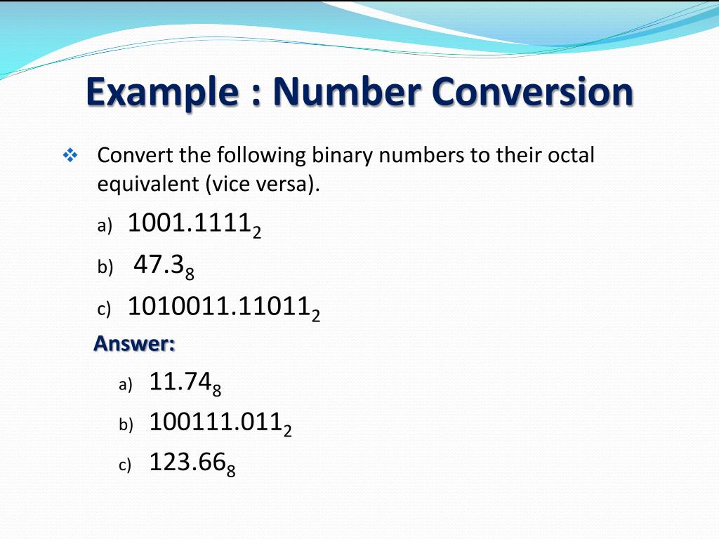 Example : Number Conversion • Convert the following binary numbers to their octal equivalent (vice versa). • 1001.11112 • 47.38 • 1010011.110112 Answer: • 11.748 • 100111.0112 • 123.668