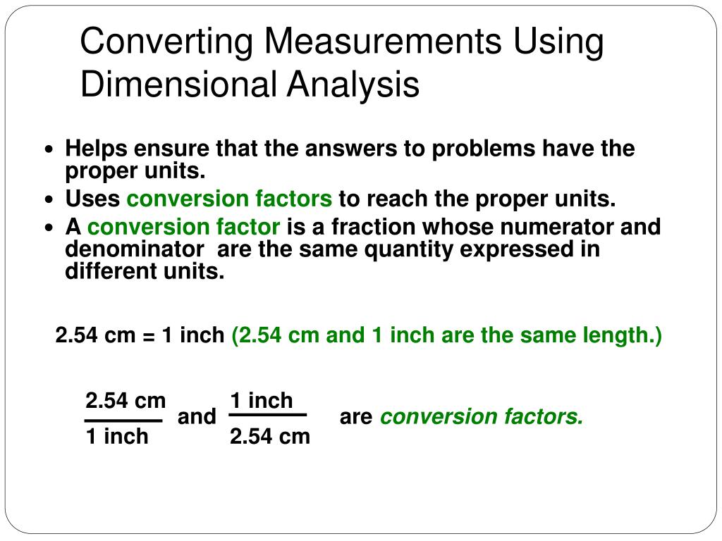 Converting Measurements Using Dimensional Analysis • Helps ensure that the answers to problems have the proper units. • Uses conversion factorsto reach the proper units. • Aconversion factoris a fraction whose numerator and denominator are the same quantity expressed in different units. 2.54 cm = 1 inch (2.54 cm and 1 inch are the same length.) 2.54 cm 1 inch and are conversion factors. 1 inch 2.54 cm