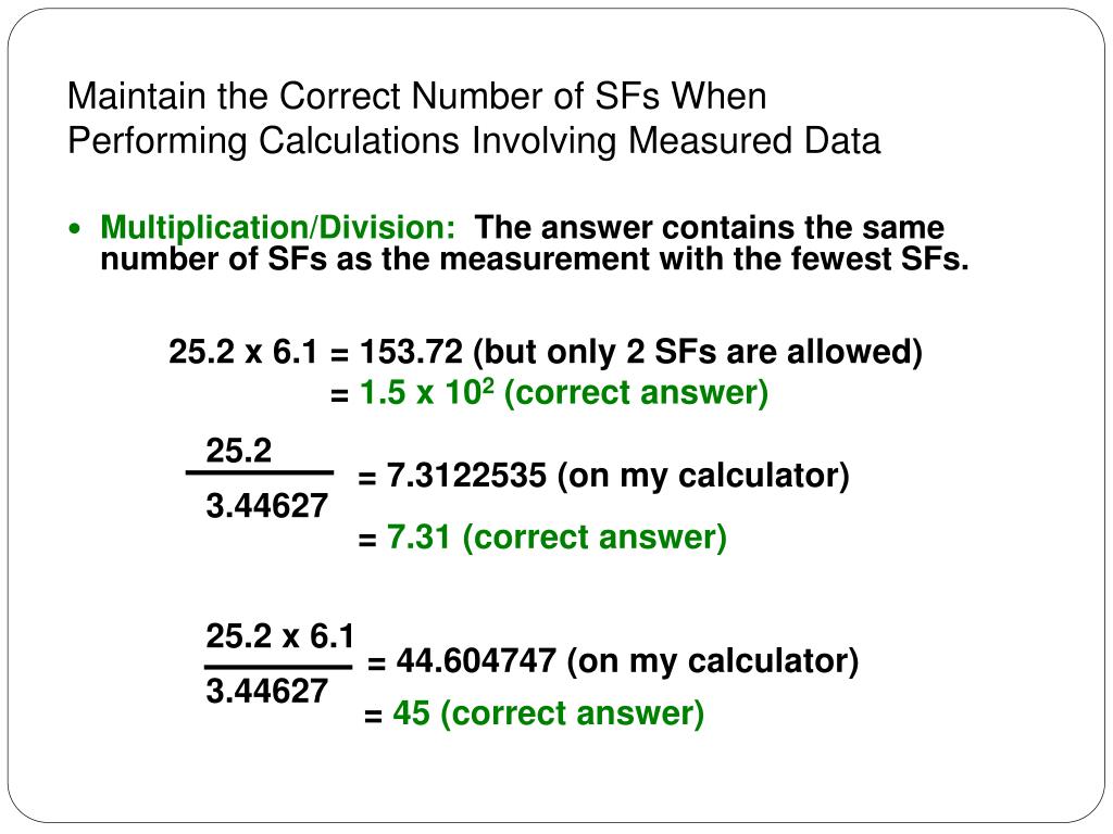Maintain the Correct Number of SFs When Performing Calculations Involving Measured Data • Multiplication/Division: The answer contains the same number of SFs as the measurement with the fewest SFs. 25.2 x 6.1 = 153.72 (but only 2 SFs are allowed) = 1.5 x 102 (correct answer) 25.2 = 7.3122535 (on my calculator) 3.44627 = 7.31 (correct answer) 25.2 x 6.1 = 44.604747 (on my calculator) 3.44627 = 45 (correct answer)
