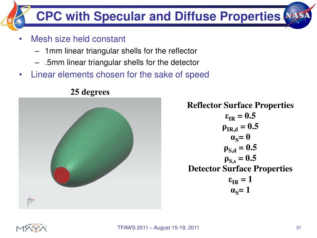 CPC with Specular and Diffuse Properties • Mesh size held constant • 1mm linear triangular shells for the reflector • .5mm linear triangular shells for the detector • Linear elements chosen for the sake of speed 25 degrees Reflector Surface Properties εIR = 0.5 ρIR,d = 0.5 αS= 0 ρS,d = 0.5 ρS,s = 0.5 Detector Surface Properties εIR = 1 αS= 1 TFAWS 2011 – August 15-19, 2011