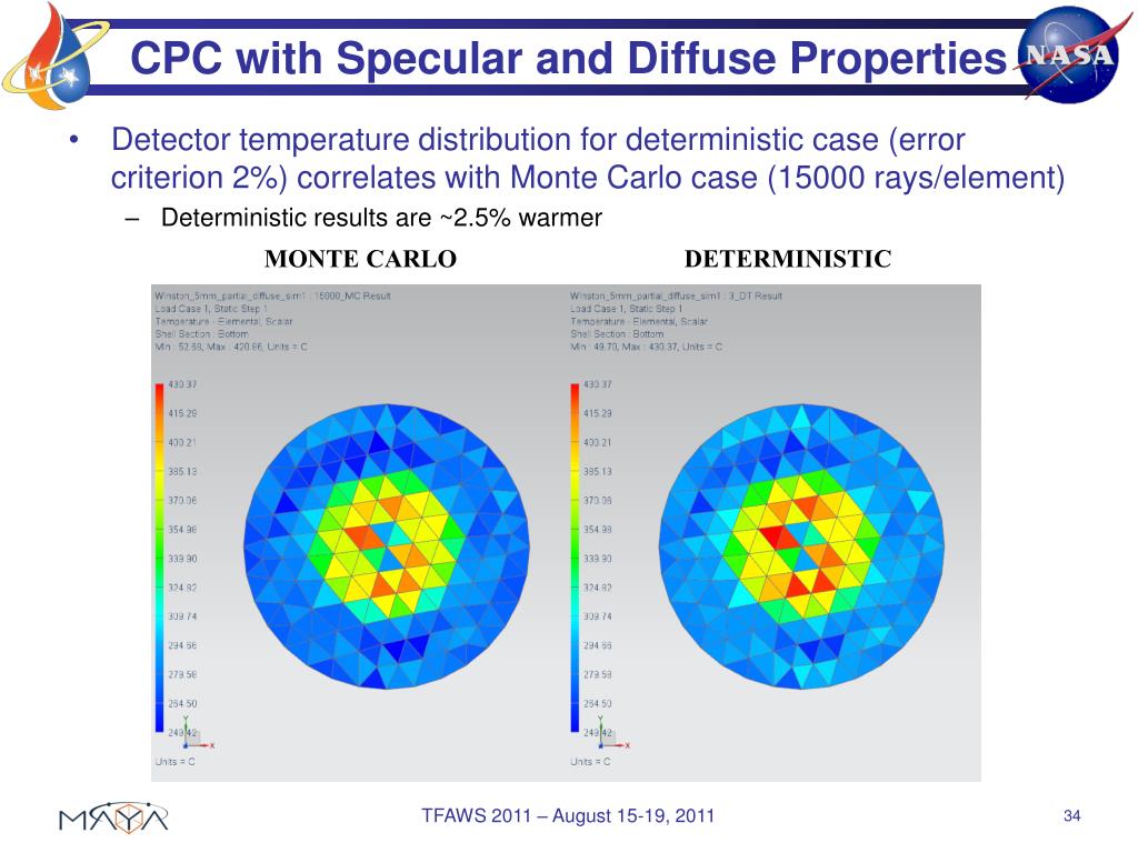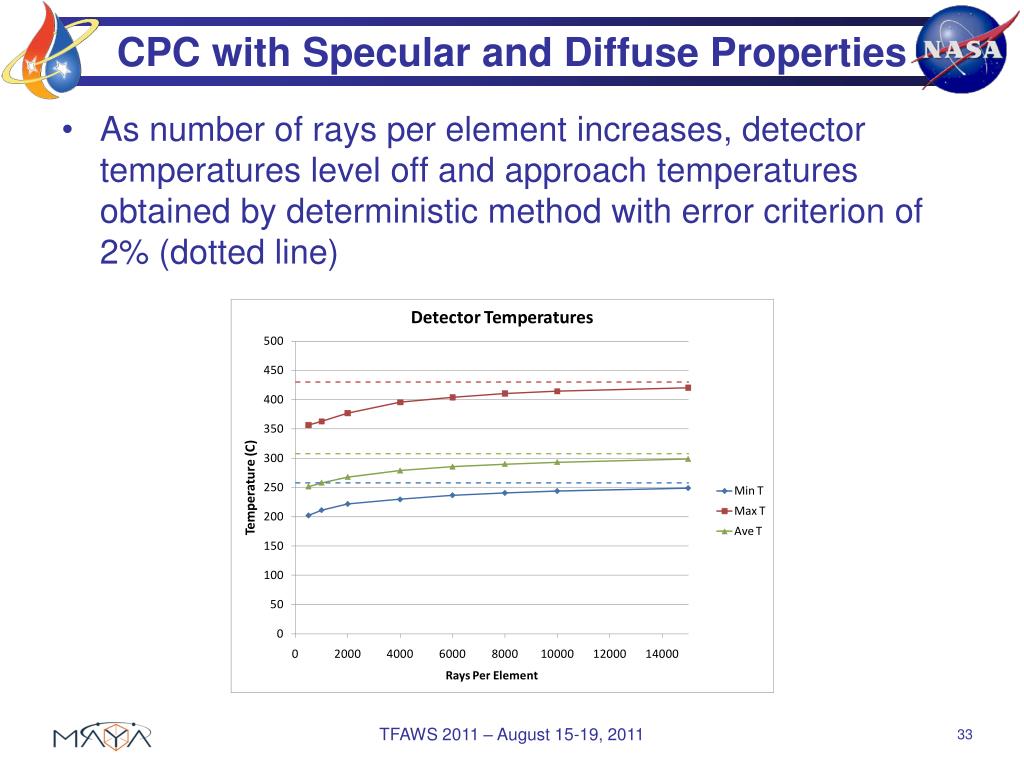 CPC with Specular and Diffuse Properties • As number of rays per element increases, detector temperatures level off and approach temperatures obtained by deterministic method with error criterion of 2% (dotted line) TFAWS 2011 – August 15-19, 2011
