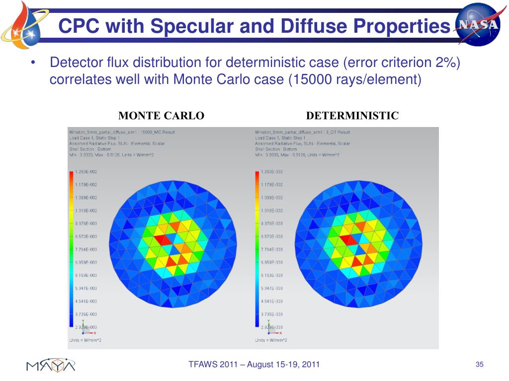 CPC with Specular and Diffuse Properties • Detector flux distribution for deterministic case (error criterion 2%) correlates well with Monte Carlo case (15000 rays/element) MONTE CARLO DETERMINISTIC TFAWS 2011 – August 15-19, 2011