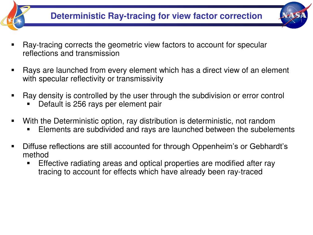 Deterministic Ray-tracing for view factor correction • Ray-tracing corrects the geometric view factors to account for specular reflections and transmission • Rays are launched from every element which has a direct view of an element with specular reflectivity or transmissivity • Ray density is controlled by the user through the subdivision or error control • Default is 256 rays per element pair • With the Deterministic option, ray distribution is deterministic, not random • Elements are subdivided and rays are launched between the subelements • Diffuse reflections are still accounted for through Oppenheim’s or Gebhardt’smethod • Effective radiating areas and optical properties are modified after ray tracing to account for effects which have already been ray-traced