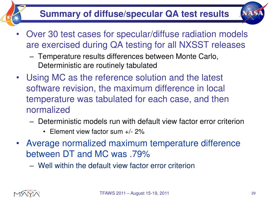 Summary of diffuse/specular QA test results • Over 30 test cases for specular/diffuse radiation models are exercised during QA testing for all NXSST releases • Temperature results differences between Monte Carlo, Deterministic are routinely tabulated • Using MC as the reference solution and the latest software revision, the maximum difference in local temperature was tabulated for each case, and then normalized • Deterministic models run with default view factor error criterion • Element view factor sum +/- 2% • Average normalized maximum temperature difference between DT and MC was .79% • Well within the default view factor error criterion TFAWS 2011 – August 15-19, 2011