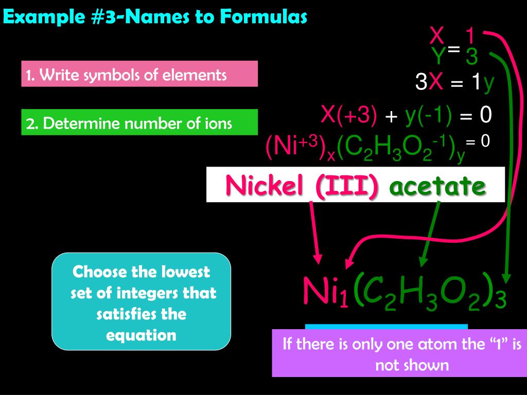 Example #3-Names to Formulas X1 = Y 3 Nickel (III) acetate 1. Write symbols of elements 3X = 1y X(+3) + y(-1) = 0 2. Determine number of ions (Ni+3)x(C2H3O2-1)y= 0 Choose the lowest set of integers thatsatisfies the equation ( )3 C2H3O2 Ni 1 Final Formula If there is only one atom the “1” is not shown