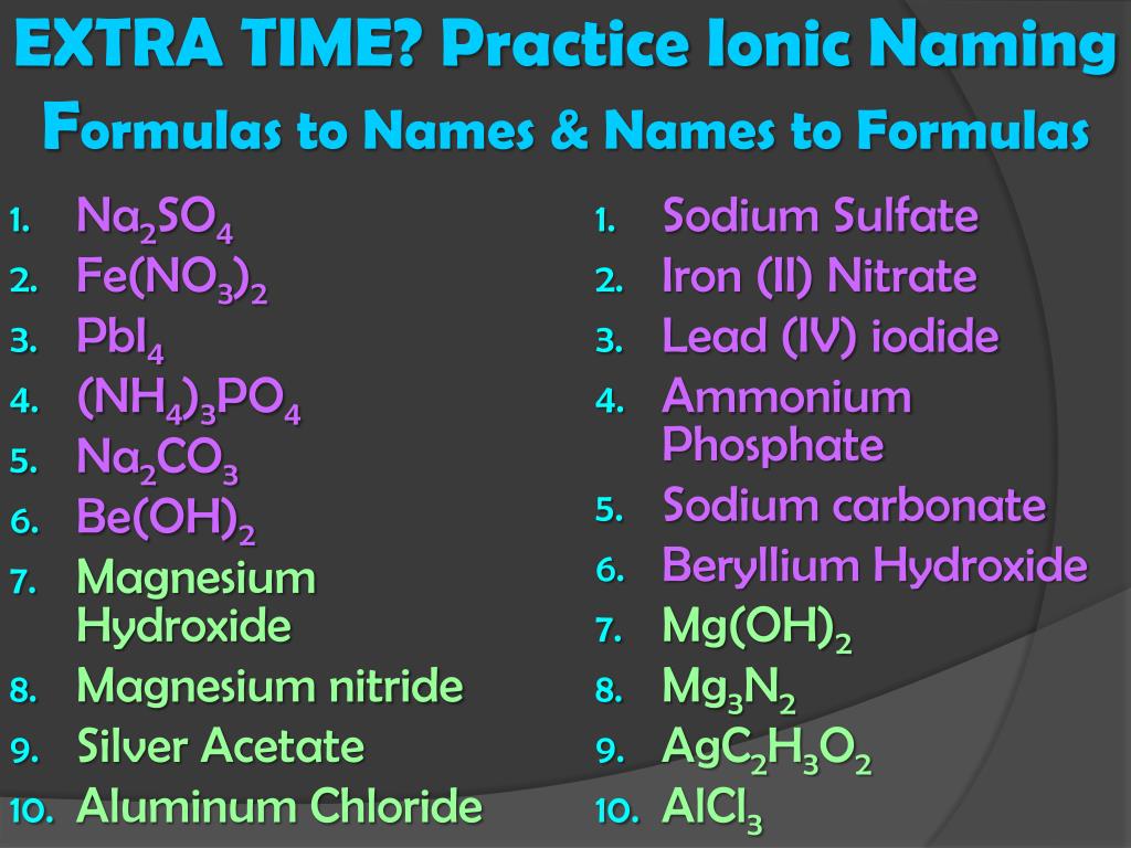 EXTRA TIME? Practice Ionic NamingFormulas to Names & Names to Formulas • Na2SO4 • Fe(NO3)2 • PbI4 • (NH4)3PO4 • Na2CO3 • Be(OH)2 • Magnesium Hydroxide • Magnesium nitride • Silver Acetate • Aluminum Chloride • Sodium Sulfate • Iron (II) Nitrate • Lead (IV) iodide • Ammonium Phosphate • Sodium carbonate • Beryllium Hydroxide • Mg(OH)2 • Mg3N2 • AgC2H3O2 • AlCl3