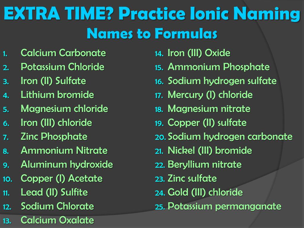 EXTRA TIME? Practice Ionic NamingNames to Formulas • Calcium Carbonate • Potassium Chloride • Iron (II) Sulfate • Lithium bromide • Magnesium chloride • Iron (III) chloride • Zinc Phosphate • Ammonium Nitrate • Aluminum hydroxide • Copper (I) Acetate • Lead (II) Sulfite • Sodium Chlorate • Calcium Oxalate • Iron (III) Oxide • Ammonium Phosphate • Sodium hydrogen sulfate • Mercury (I) chloride • Magnesium nitrate • Copper (II) sulfate • Sodium hydrogen carbonate • Nickel (III) bromide • Beryllium nitrate • Zinc sulfate • Gold (III) chloride • Potassium permanganate