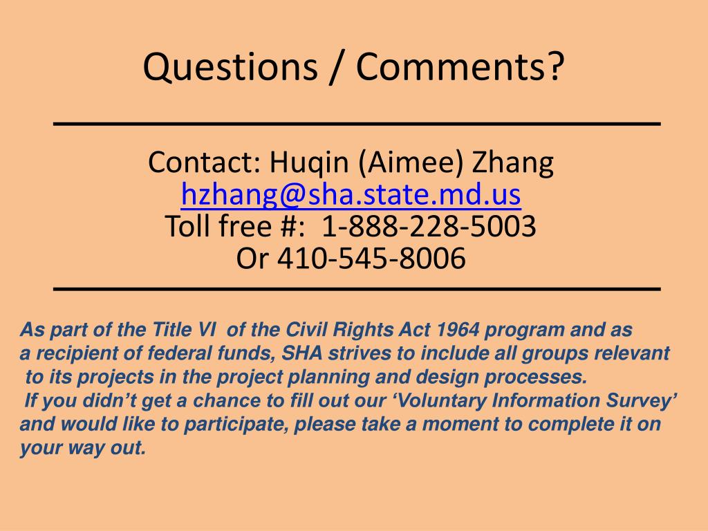 Questions / Comments? Contact: Huqin (Aimee) Zhanghzhang@sha.state.md.us Toll free #: 1-888-228-5003 Or 410-545-8006 As part of the Title VI of the Civil Rights Act 1964 program and as a recipient of federal funds, SHA strives to include all groups relevant to its projects in the project planning and design processes. If you didn’t get a chance to fill out our ‘Voluntary Information Survey’ and would like to participate, please take a moment to complete it on your way out.