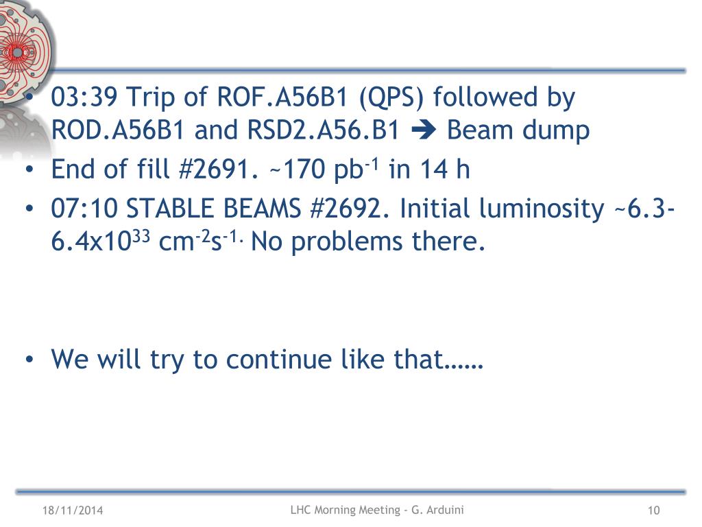 03:39 Trip of ROF.A56B1 (QPS) followed by ROD.A56B1 and RSD2.A56.B1 Beam dump End of fill #2691. ~170 pb-1 in 14 h 07:10 STABLE BEAMS #2692. Initial luminosity ~6.3-6.4x1033cm-2s-1. No problems there. We will try to continue like that…… LHC Morning Meeting - G. Arduini