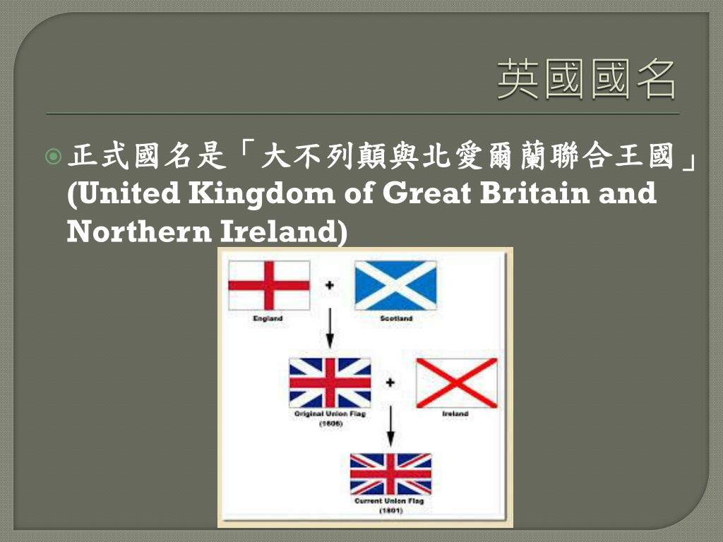 英國國名 正式國名是「大不列顛與北愛爾蘭聯合王國」(United Kingdom of Great Britain and Northern Ireland)