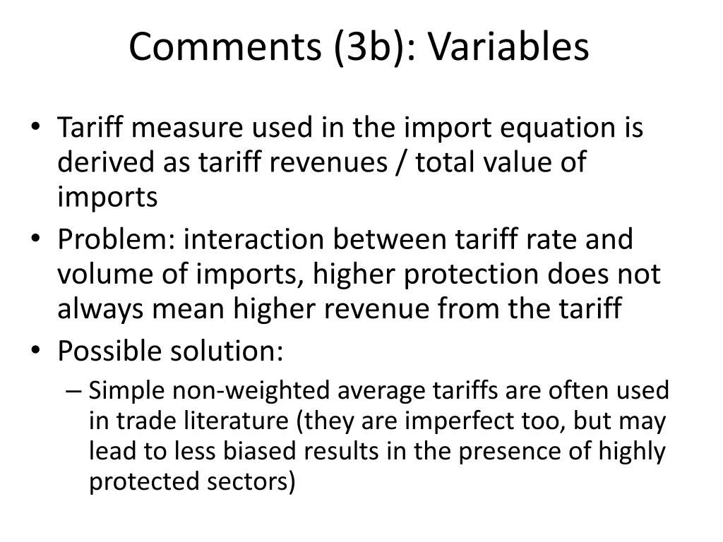 Comments (3b): Variables • Tariff measure used in the import equation is derived as tariff revenues / total value of imports • Problem: interaction between tariff rate and volume of imports, higher protection does not always mean higher revenue from the tariff • Possible solution: • Simple non-weighted average tariffs are often used in trade literature (they are imperfect too, but may lead to less biased results in the presence of highly protected sectors)