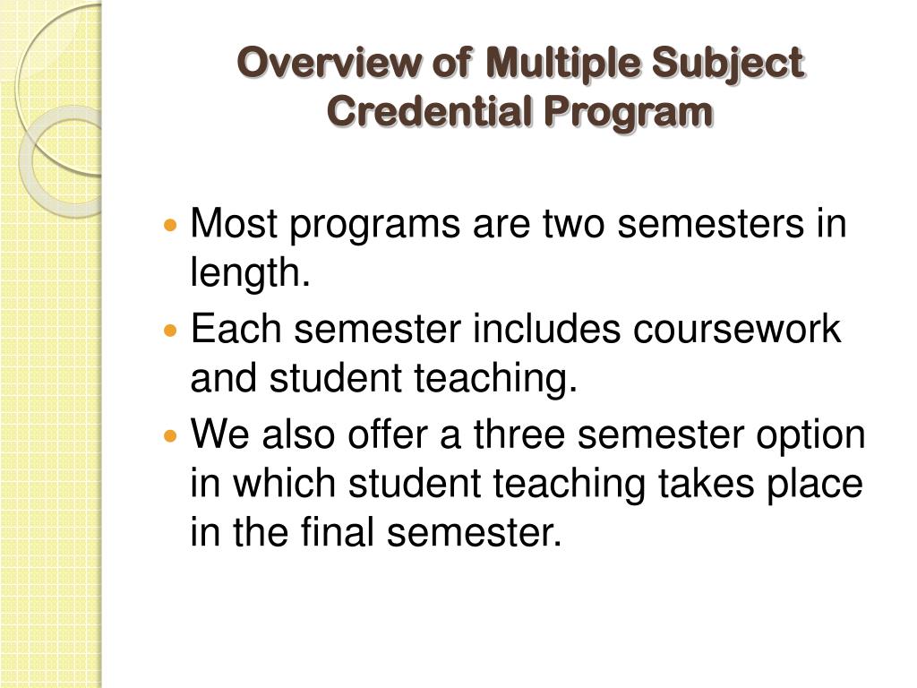 Overview of Multiple Subject Credential Program • Most programs are two semesters in length. • Each semester includes coursework and student teaching. • We also offer a three semester option in which student teaching takes place in the final semester.