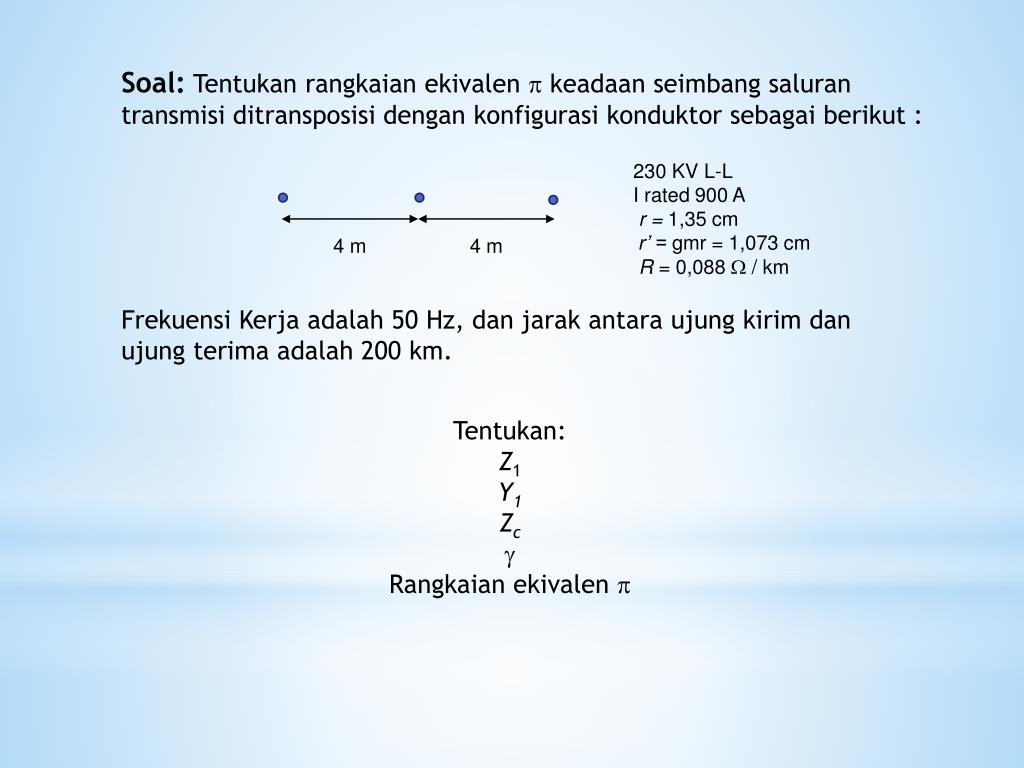 Soal:Tentukanrangkaianekivalenkeadaanseimbangsalurantransmisiditransposisidengankonfigurasikonduktorsebagaiberikut : 230 KV L-L I rated 900 A r = 1,35 cm r’ = gmr = 1,073 cm R = 0,088 / km 4 m 4 m FrekuensiKerjaadalah 50 Hz, danjarakantaraujungkirimdanujungterimaadalah 200 km. Tentukan: Z1 Y1 Zc Rangkaianekivalen