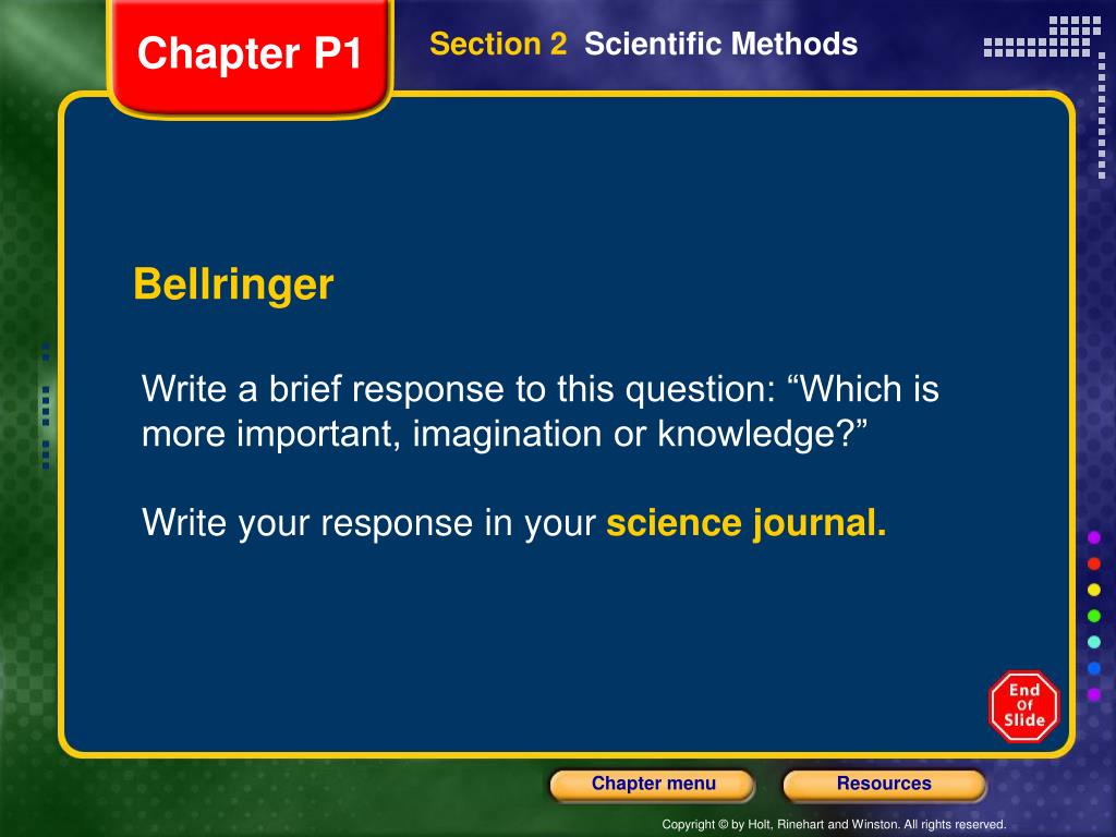 Section2 Scientific Methods Chapter P1 Bellringer Write a brief response to this question: “Which is more important, imagination or knowledge?” Write your response in your science journal.