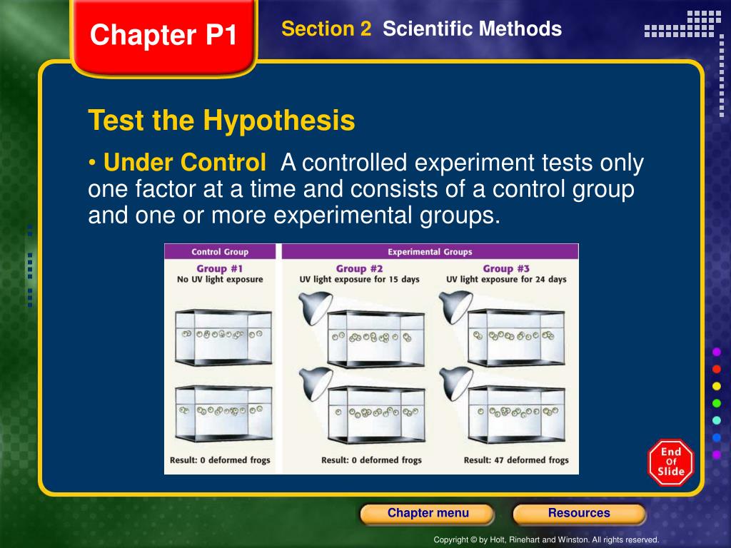 Section2 Scientific Methods Chapter P1 Test the Hypothesis • Under Control A controlled experiment tests only one factor at a time and consists of a control group and one or more experimental groups.
