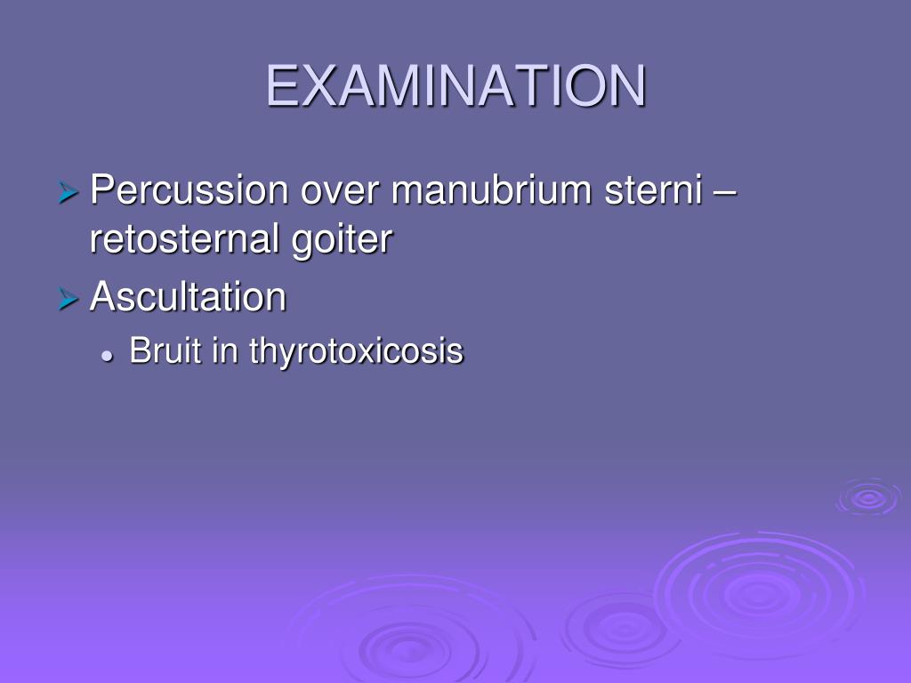EXAMINATION • Percussion over manubrium sterni –retosternal goiter • Ascultation • Bruit in thyrotoxicosis
